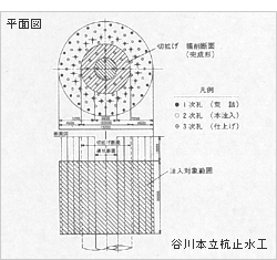 | 注入の目的 | 谷川立坑は関越トンネルの換気用立坑として築造されるが、立坑掘削に際して崖錐または旧河床堆積物である玉石砂礫層の中を流れる多量の伏流水が湧出する恐れがあり、これを防止する目的で事前に立坑周囲にグラウト注入を行った。 |
